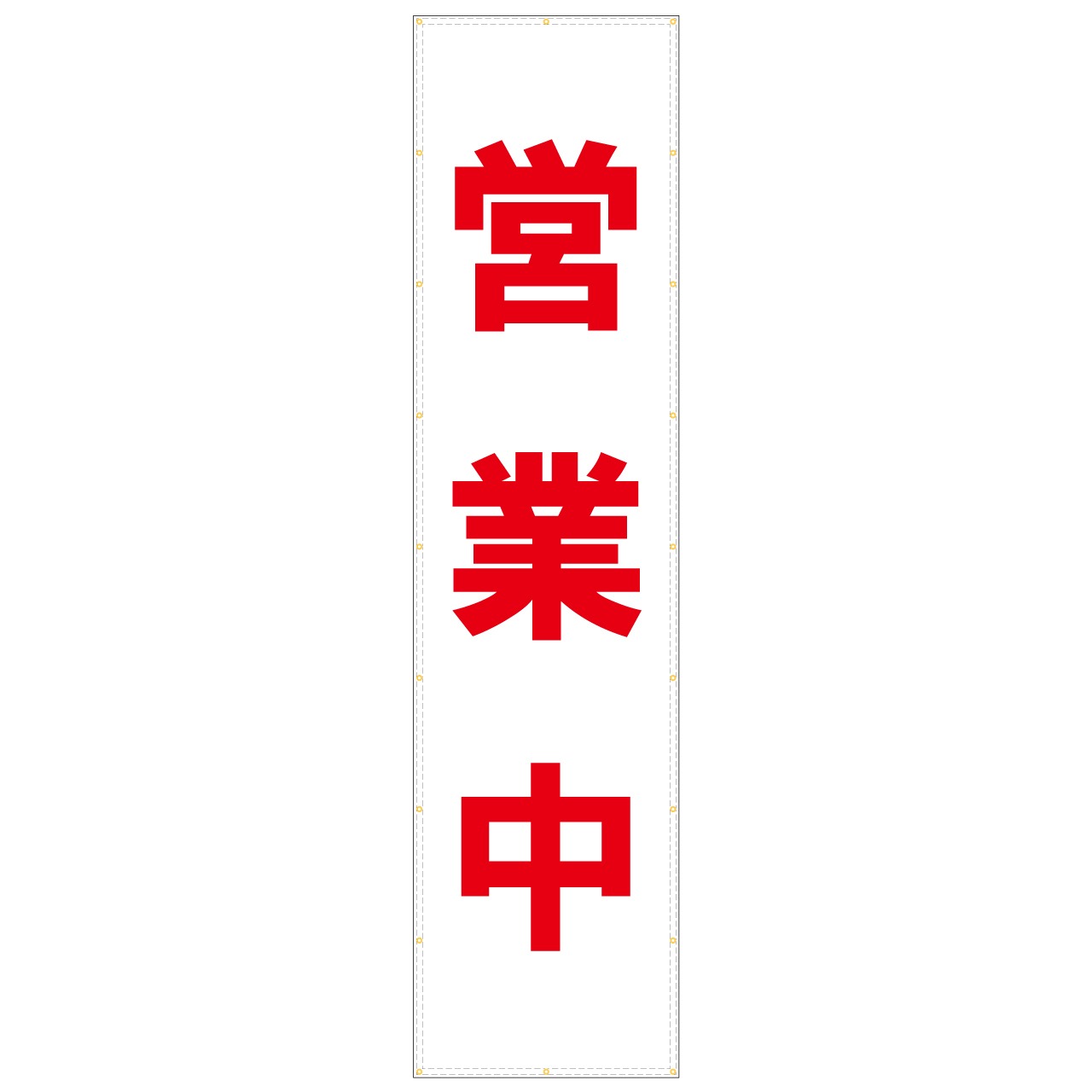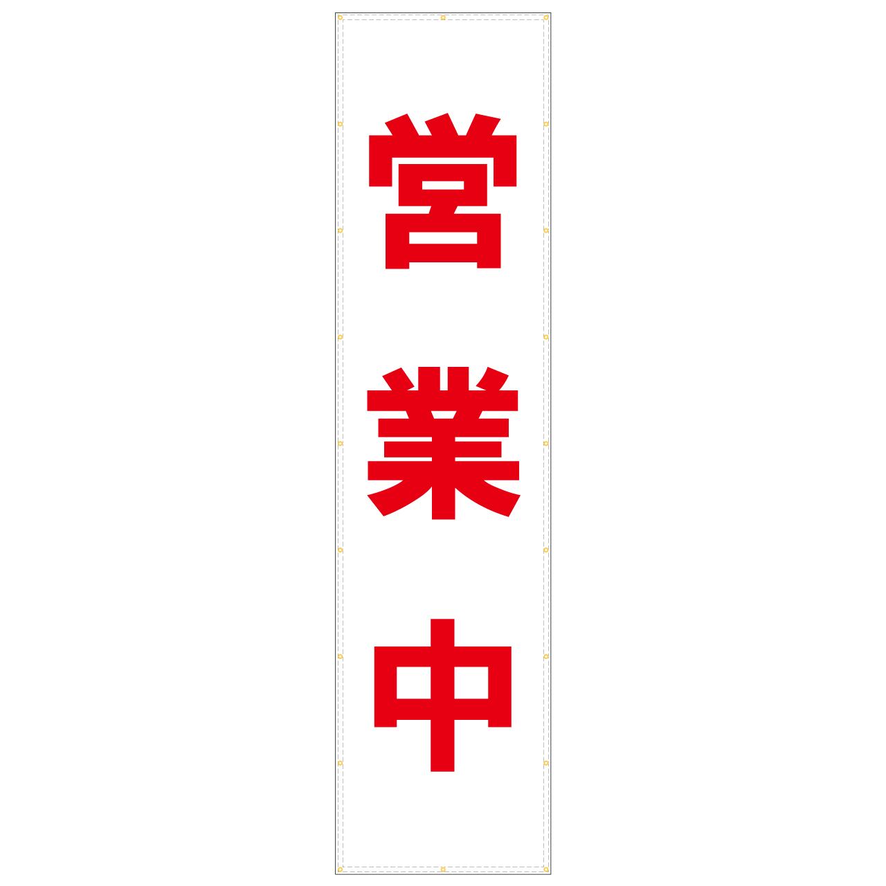 白地に赤文字で「営業中」と大きく印刷されています。1文字あたりの高さは約60cmと大きく、遠くからでもはっきり視認可能です。目を引くデザインで店舗が営業中であることを強くアピールできます。